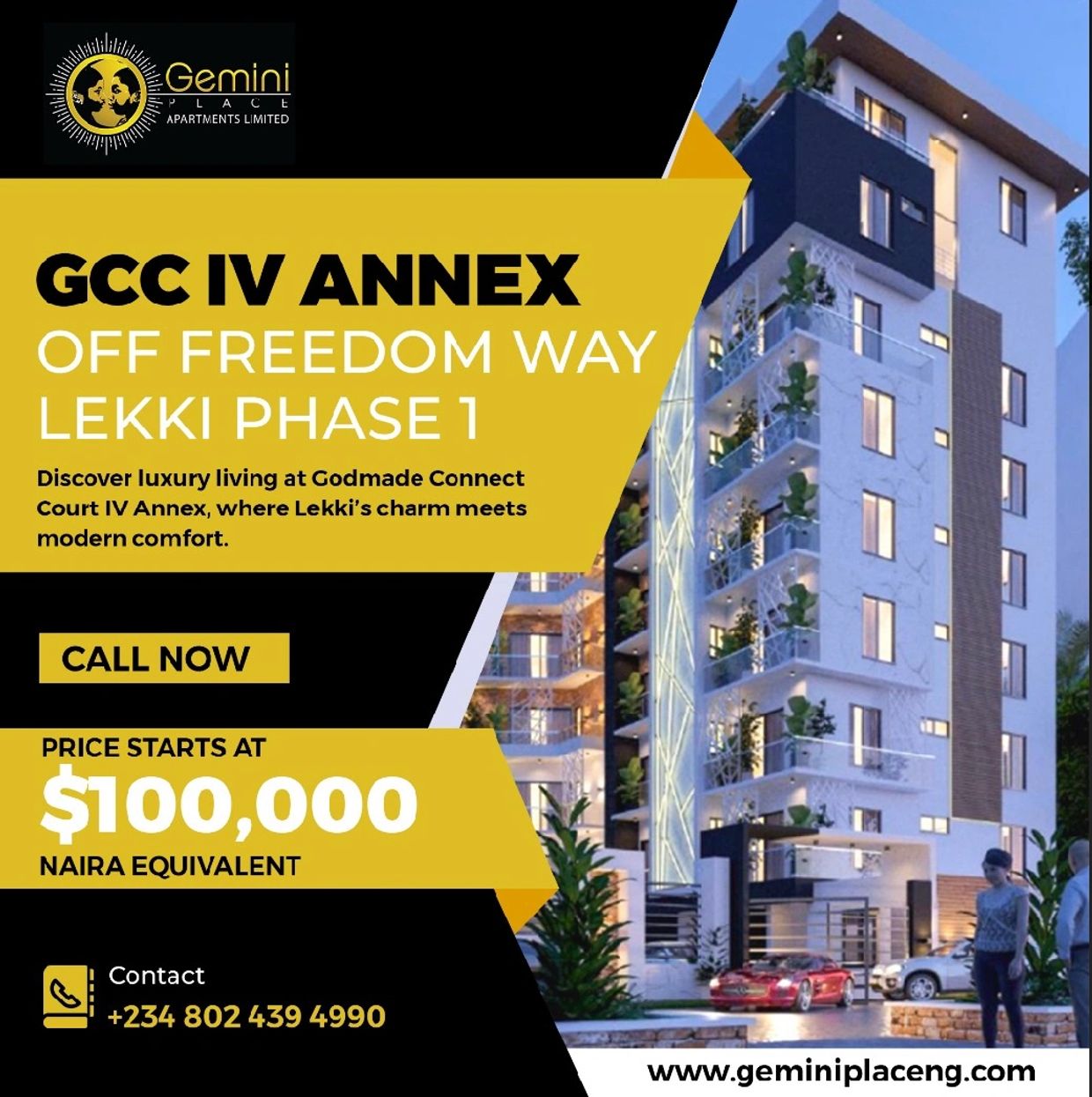 Introducing GCC IV ANNEX, nestled along the prestigious Freedom Way in Lekki Phase 1, where luxury meets convenience. Elevate your lifestyle with our meticulously crafted 2-bedroom flats starting at $100,000 and spacious 3-bedroom flats at $140,000. Experience unparalleled comfort and elegance in every corner, with modern amenities and breathtaking views. Embrace the epitome of urban living at GCC IV ANNEX. Your dream home awaits.(Off Plan)