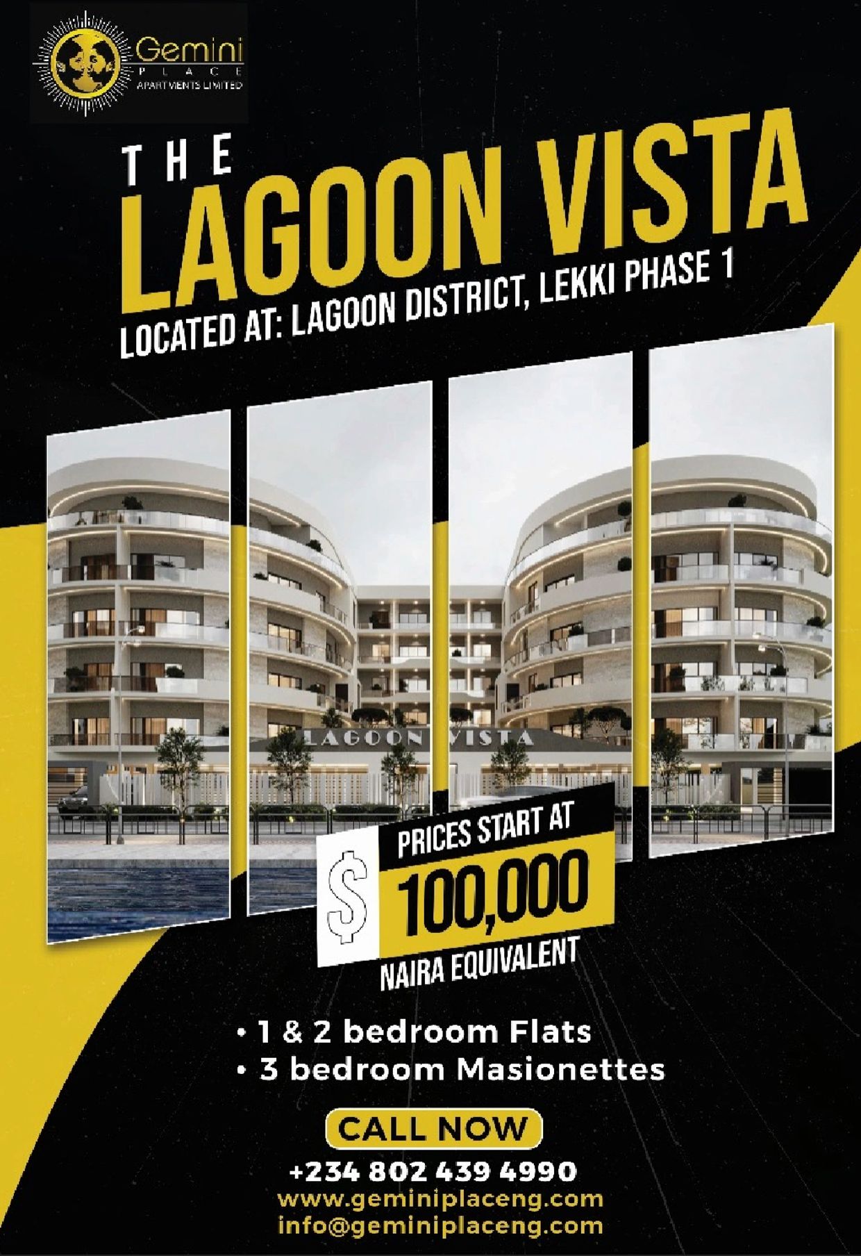 Introducing Lagoon Vista in Lekki Phase 1's Lagoon District. Choose from 1 to 3-bedroom plans, starting at $100,000. Experience luxury living with modern amenities and stunning views. Contact us for details and schedule a tour today. Your gateway to upscale living awaits at Lagoon Vista.
