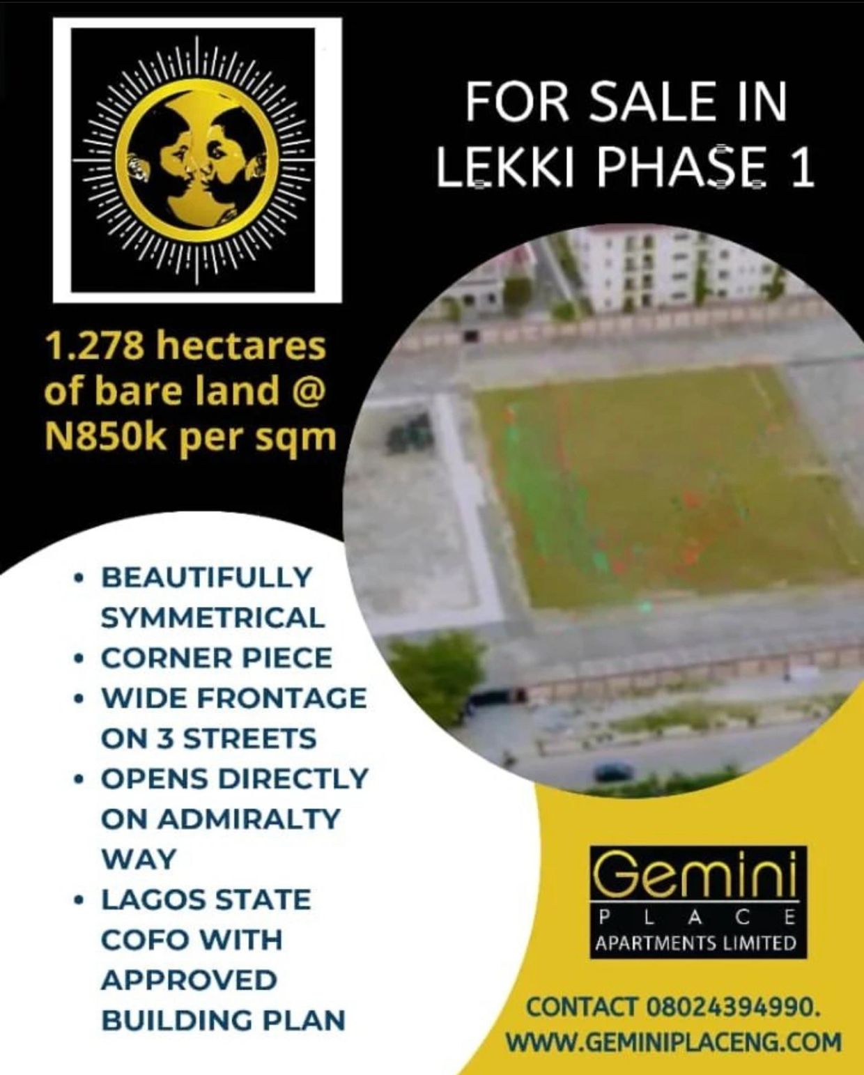 Prime opportunity awaits! 1.278-hectare land in sought-after Lekki Phase 1. Perfect for investment or development. Offered at N850k/sqm. Don't miss out on this lucrative deal! #RealEstate #LekkiPhase1 #InvestmentOpportunity"