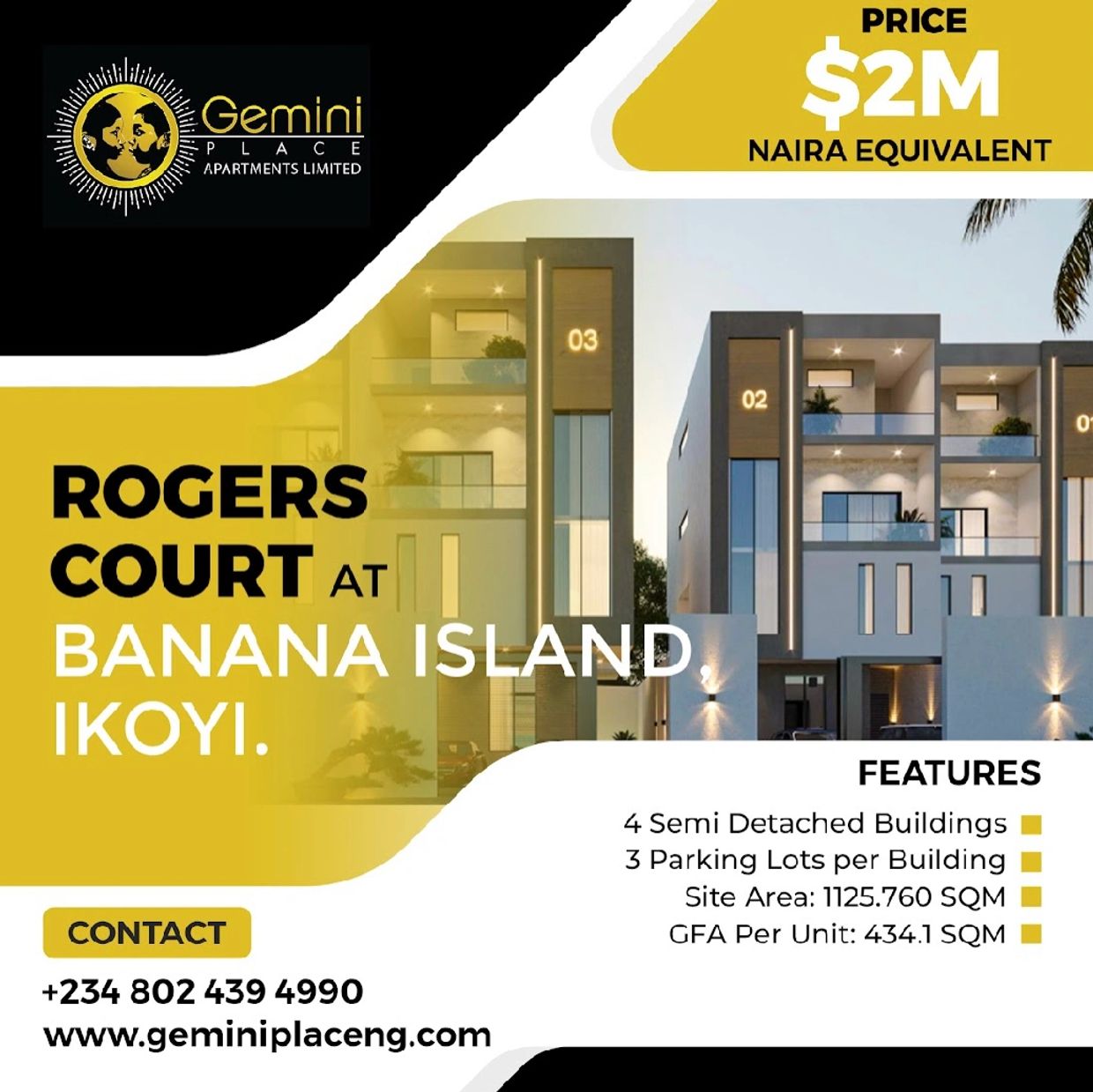 Discover luxurious living on Banana Island, Ikoyi, with Rogers Court. Indulge in spacious 4 and 3-bedroom residences, starting at $2 million. Enjoy breathtaking views, top-notch amenities, and unparalleled elegance in every detail. Elevate your lifestyle in one of Lagos's most prestigious addresses. Welcome home to Rogers Court, where luxury meets sophistication.